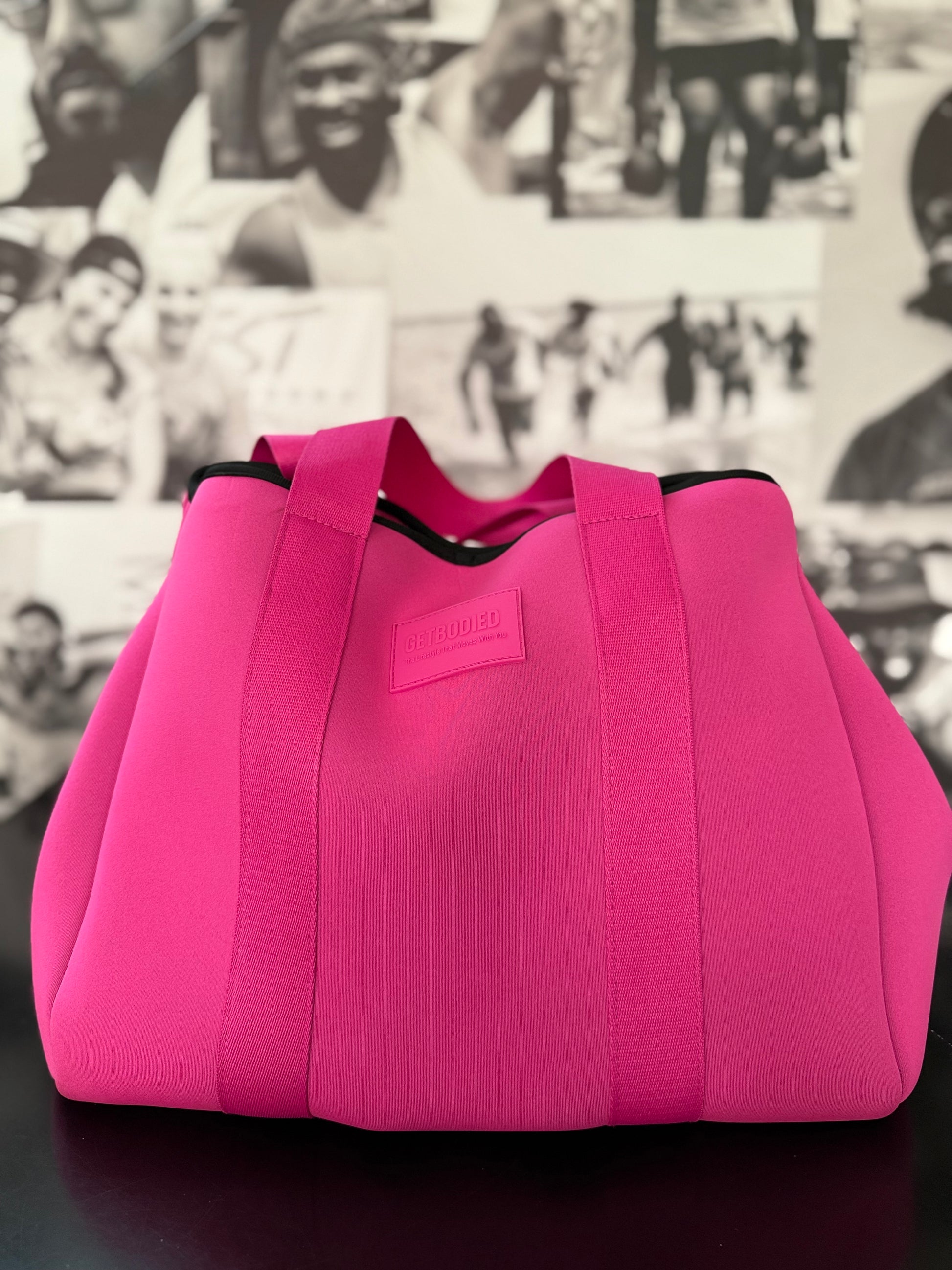 Bold, functional, and built for your lifestyle. Crafted from premium neoprene and treated for water resistance, this bag is your go-to for gym, travel, or everyday carry. Spacious enough for all your essentials, yet sleek enough to stand out. Finished in a vibrant pink with the embossed GetBodied branding — style meets durability.